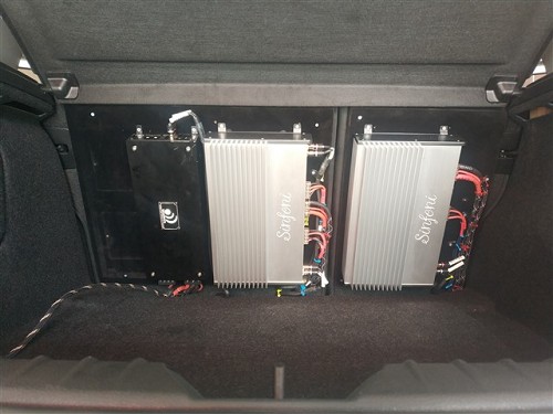 采用詩芬尼PA4100四路功放和詩芬尼PA2100二路功放推動前聲場三分頻,做主動分頻處理;低頻的缺失,用一只法國勁浪M系列10寸超低音搭配美國猛士1500.1單路功放來彌補。三臺功放都懸掛安裝在尾箱,節省空間的同時又利于散熱。