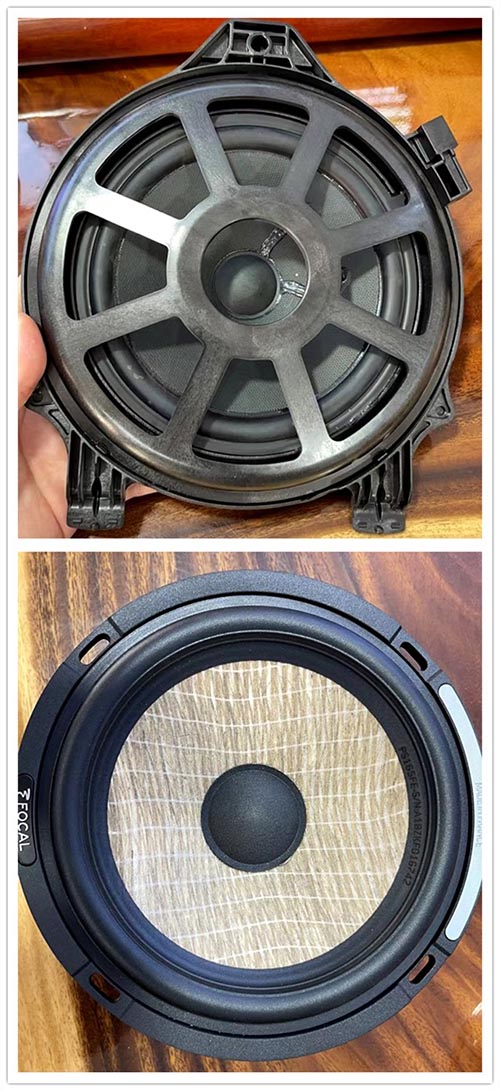 原車中低音(上)與勁浪專車專用中低音(下)對比照,原車喇叭塑料感太強,做工差。而勁浪中低音運用亞麻音盆及鋁制框架,高質感的飾面效果明顯略勝一籌!