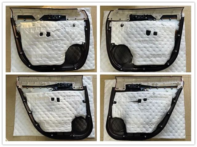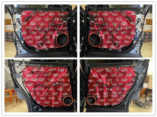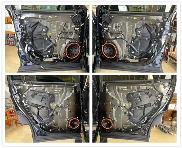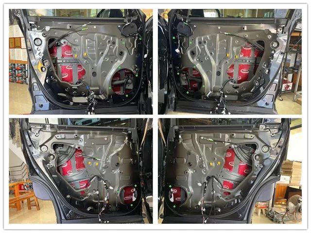 隨后,改裝師拆開門板看到其內部結構空洞,鋼板較薄,容易引起共振;利用大能紅派、超級溫莎對門板進行三層隔音處理,不僅能抑制車門薄弱鋼板的震動,降低傳入車艙的風噪,還可以增加門板的剛性與密封性。從而使車門更加適合成為揚聲器的箱體,以確保聲音更加清晰通透。