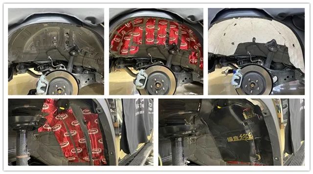 輪胎與地面摩擦會產生很大的胎噪,此類噪聲主要通過輪弧傳入到車廂內部。使用大能隔音材料對輪弧做精密隔音處理,相當于切斷胎噪的傳播途徑,有效減少胎噪傳入車廂。