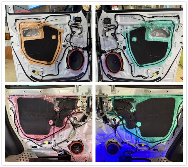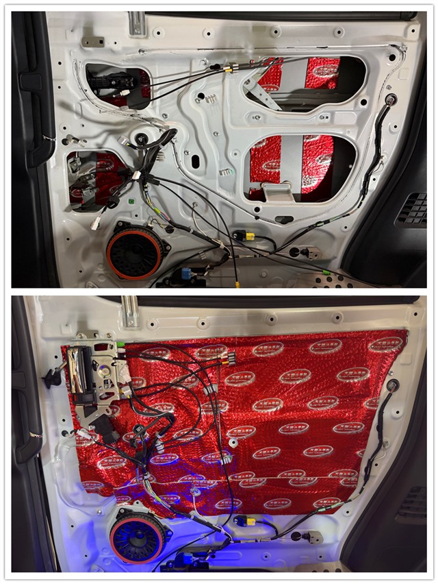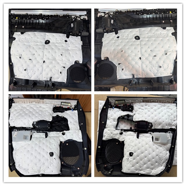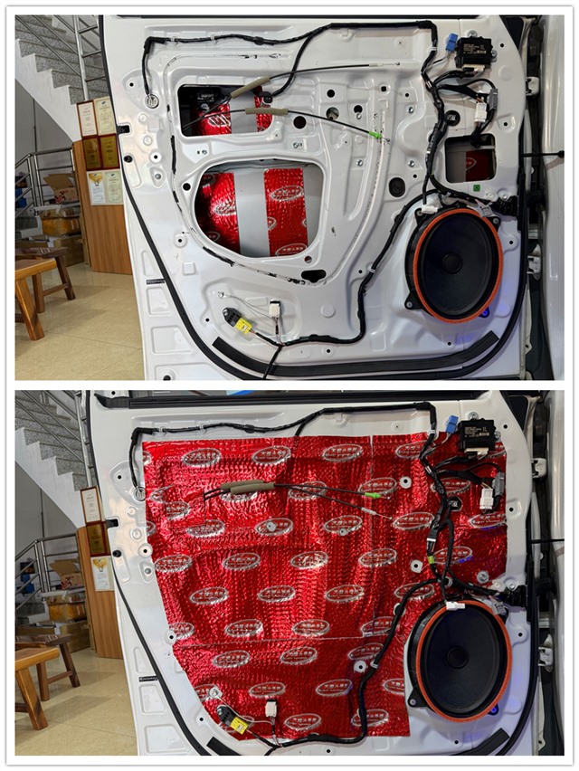 門板最容易受到外界噪音的影響,像風(fēng)噪和共振,大多就是通過這里傳進來的。為了改善這一情況,改裝師先在門板貼上雙層大能紅派隔音材料。強化鈑金結(jié)構(gòu),減少因震動帶來的噪音。接著,又在門板飾蓋上粘貼一層大能溫莎吸音棉。這種吸音棉是用柔軟而高密度的材料制成的,能有效吸收中高頻的雜音。兩種材料搭配使用,能大大提升門板的隔音效果,讓車內(nèi)環(huán)境更加安靜、舒適。