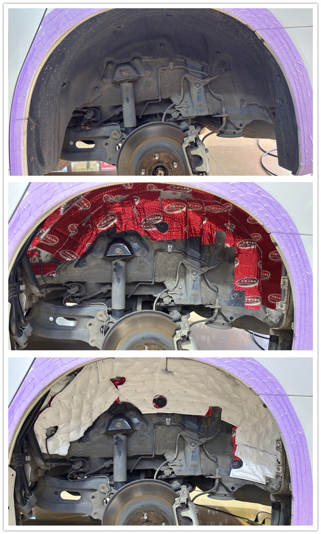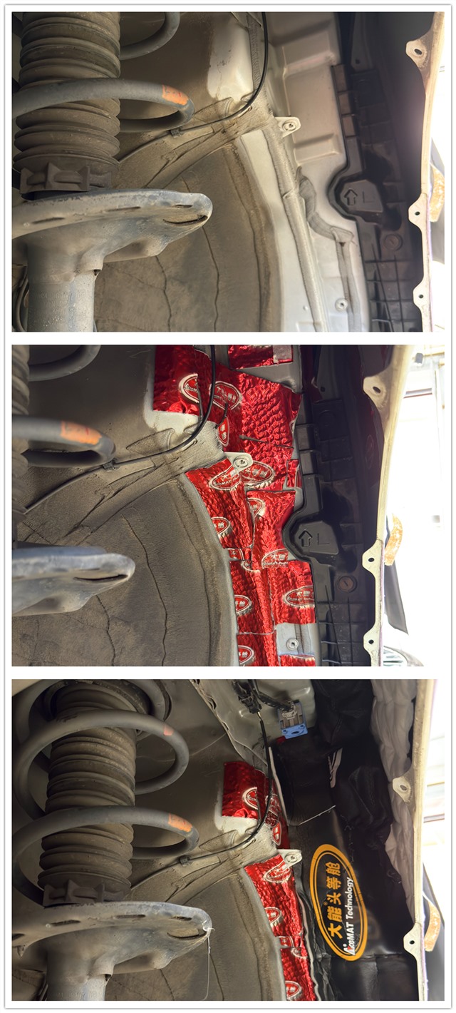 汽車在高速行駛或經(jīng)過路面粗糙時,胎噪更為明顯。為有效降低胎噪,改裝師在四個輪弧內(nèi)側(cè)貼合了大能隔音材料。可以增強輪弧結(jié)構(gòu)的剛性,從而有效抑制共振和滾動噪音的傳入。在安裝過程中,根據(jù)每個輪腔的曲面結(jié)構(gòu),精細裁剪并彎折材料,使其嚴密貼合鈑金表面,確保無空鼓、無翹邊,最大限度發(fā)揮材料的隔音減震效果。