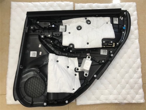 斯巴魯森林人原車門板只有一層防水薄膜,可以清晰的看到薄膜下只有裸露的鈑金,揚聲器在高強度工作下就會與鈑金強烈的共振,從而嚴重影響音響效果。